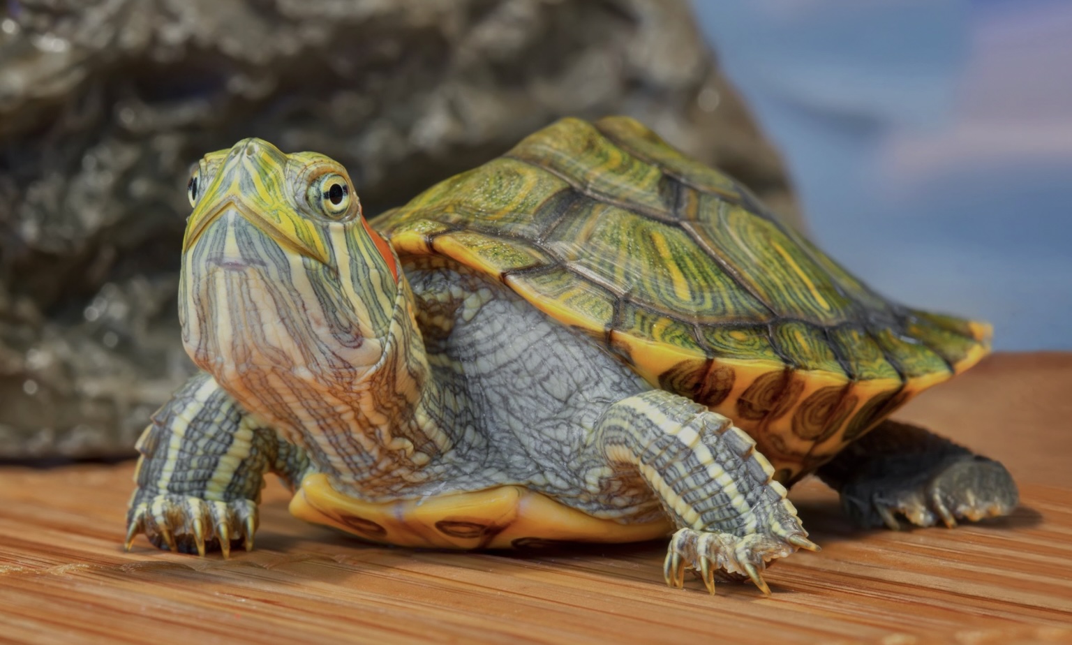 TartarugaPrincipalmente aquática, com casco mais plano.Aquaterrário: Grande tanque com bastante profundidade para natação, e uma área seca (basking area) para descanso e aquecimento.