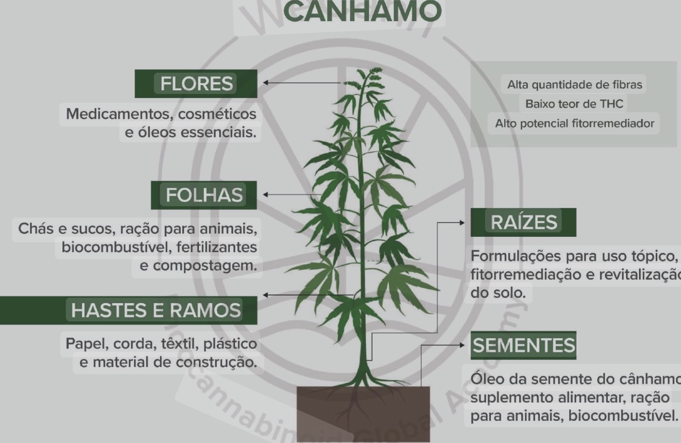 - Cânhamo Industrial (Hemp): É a variedade da Cannabis cultivada com níveis de THC extremamente baixos, geralmente abaixo de 0,3% (limite que pode variar por país). Essa concentração é insuficiente para gerar qualquer efeito psicoativo ou “barato”. É cultivado por suas fibras, sementes e pelo alto teor de Canabidiol (CBD).